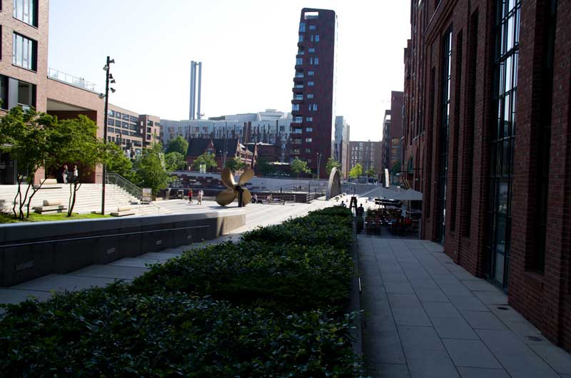 Wir gehen dann wieder zurück zum Brooktorkai, über die Ampel vor dem Spiegelgebäude und auf dieser Straßenseite rechhts bis zur Shanghaiallee. Dort einmal links und die nächste gleich wieder rechts, in die Koreastraße. Das erste Haus auf der rechten Seite gehört wahrscheinlich zu den attraktivsten in der gesamten Hafencity. In direkter Nachbarschaft befindet sich das Maritime Museum. Einfach mal die Elbarkaden (vor der Brücke links) längs schlendern und vielleicht entdeckt man ja die ein oder andere Lokalität, um einen Kaffee zu trinken. Ich bevorzuge den Platz direkt vor dem Museum. Dort hat man einen tollen Überblick und sieht ständig Menschen an einem vorbeiziehen. Von dort aus sind auch die neuartigen Windkrafträder zu sehen. Diese befinden sind auf dem Dach des Gebäudes, in dem Greenpeace das Büro hat.