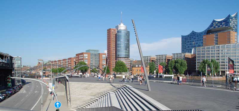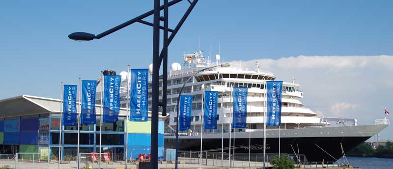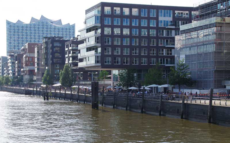 Über die Magellan-Terrassen gehe ich immer bis zur Elbe. In diesem Gebiet und rechts davon sind viele Restaurants und Cafes. An einem Wochenende lebt dieser Teil der Hafencity richtig, besonders bei gutem Wetter. Am Kai befindet sich das Hamburg Cruise Center. Hier legen viele Kreuzfahrtschiffe an und wenn die Queen Mary kommt, herrscht hier Jahrmarktatmosphäre. Wenig Menschen bevorzugen dann das Sofa zu Hause, sondern träumen von fernen Reisen.